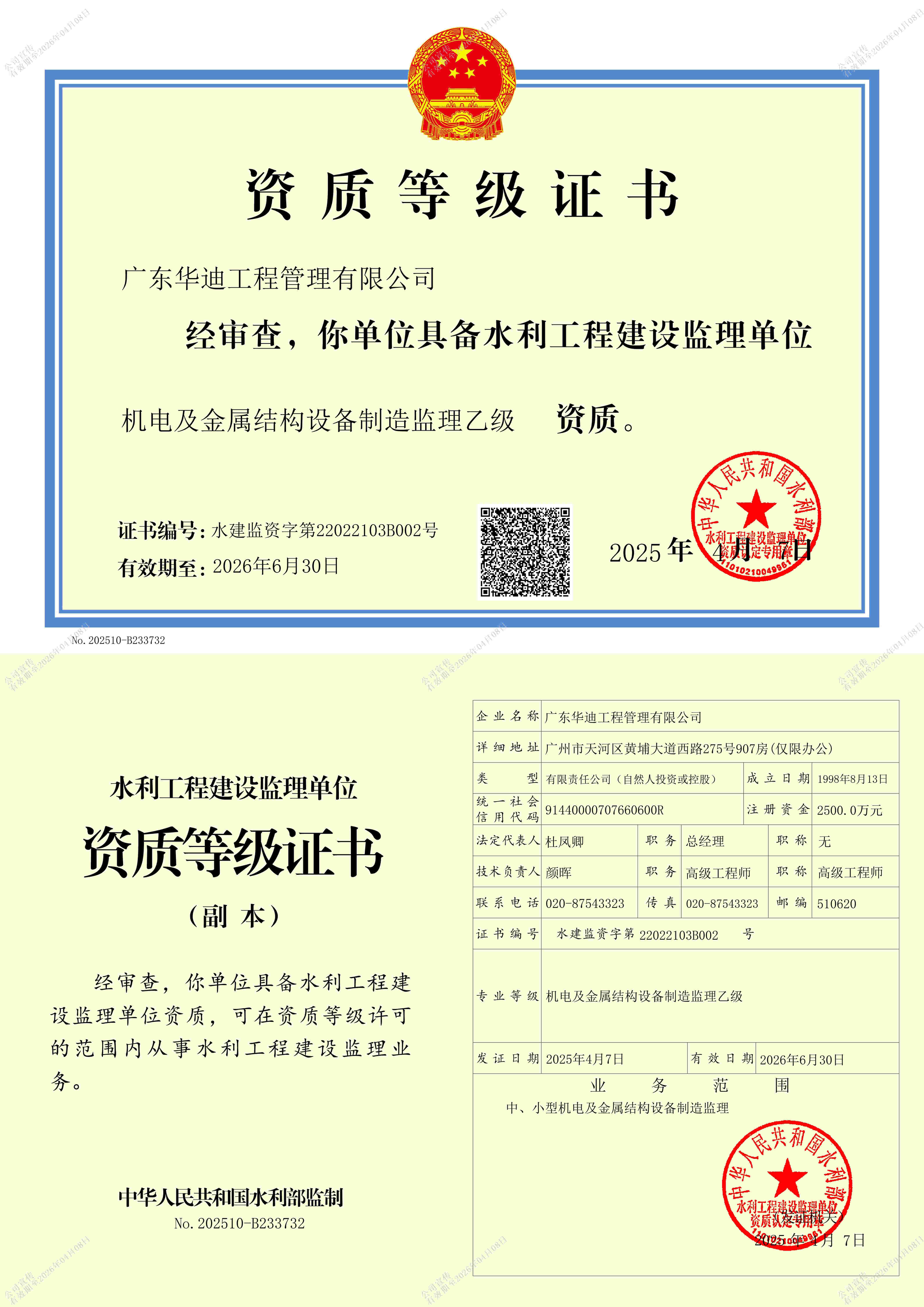 承擔所有專業工程類別建設工程項目的工程監理業務;承接各級水利工程、Ⅱ等及以下各等級水土保持工程的施工監理業務;中小型機電及金屬結構設備制造、各類各等級水利工程建設環境保護監理;